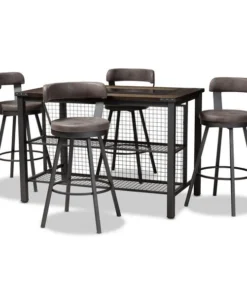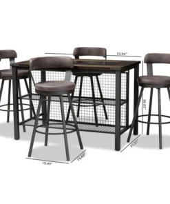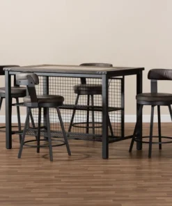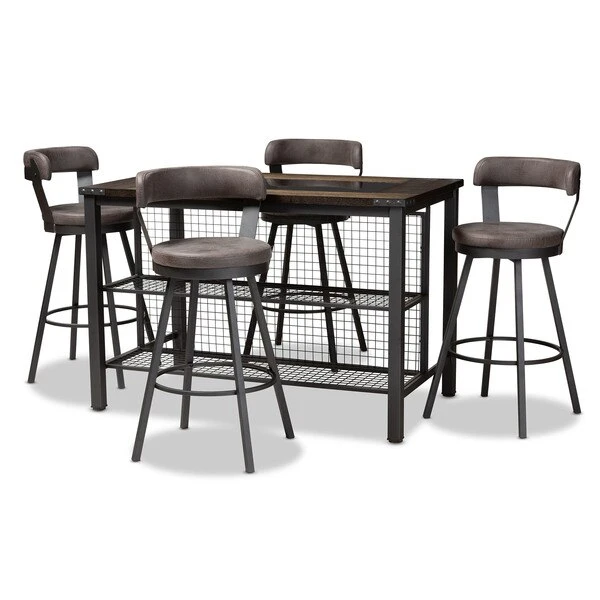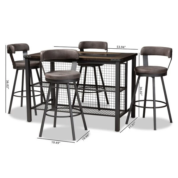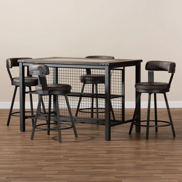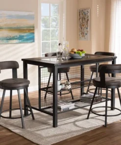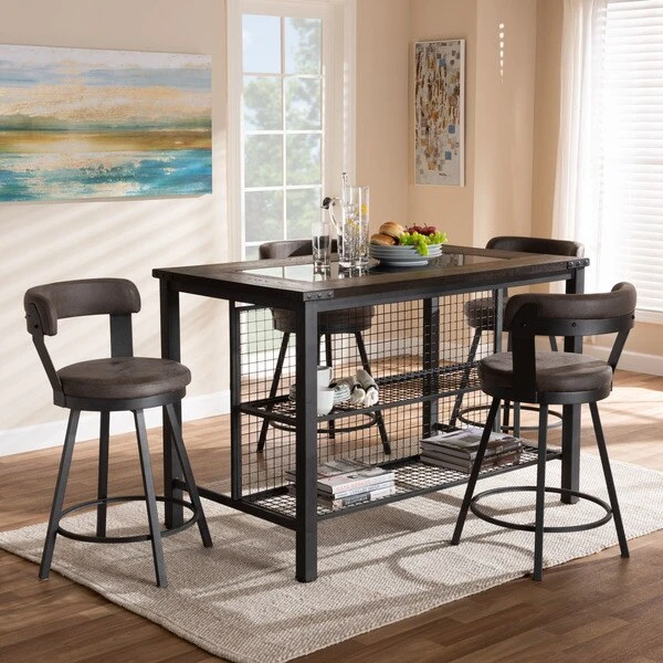 Achieve lasting style with the Arcene 5-piece pub set. The sturdy metal composition and neutral coloring are indicative of the swivel stool's rustic and industrial-inspired design. The metal frame is finished in a matte antique silver, complemented by suede-like fabric upholstered seats. The seats of the Arcene are foam padded, and the open work chair backs are curved to encourage hours of comfortable seating. The table of the Arjean features two convenient wire shelves for display or storage, which is great for small spaces. The rectangular table top has a unique pattern, finished in black glass in the middle of the table, and framed by sturdy engineered wood finished with an ash veneer. This set will look right at home in your dining room or breakfast nook. The Arcene requires assembly.
