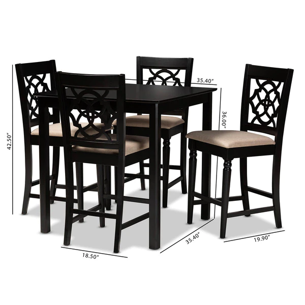 Redefine your dining space with the elegance and comfort of the Arden 5-piece pub set. Constructed from solid oak wood in an espresso finish, this pub set includes one table and four stools, each upholstered in a light polyester fabric that complements the dark wood finish. Padded with foam for the utmost comfort as you enjoy long dinners, each stool features a striking cut-out design on its back for enhanced visual appeal. Comfortable and stylish, the Arden set is sure to elevate any dining experience. The Arden 5-piece pub set requires assembly.