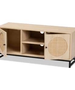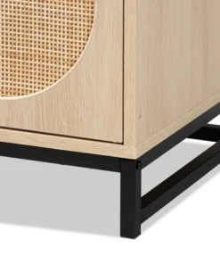 Baxton Studio Ardon Bohemian Light Brown Finished Wood and Black Metal 2-Door TV Stand with Natural Rattan