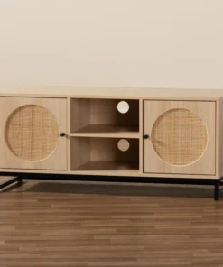 Combining retro design with modern geometry, the Ardon TV stand adds a stunning focal point to your space. Made in China, this striking piece combines natural rattan with a sturdy wood and metal frame for a tranquil, carefree display that exudes warmth. Two open shelves offer a convenient display for media devices, while two additional shelves behind the doors provide secure storage space. Requiring assembly, Ardon features two cord management holes on its back panel for quick and easy setup. Natural rattan accents add a charming, exotic touch, making the Ardon TV stand an expressive addition to any space.