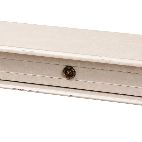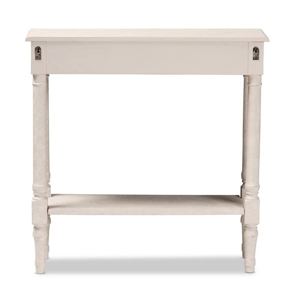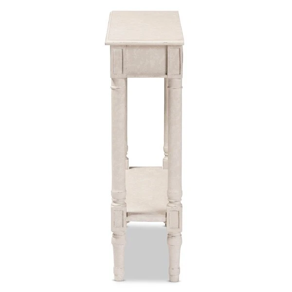 The ornate ball-turned details and the weathered look of the Ariella 1-drawer console table will add an element of romance and bygone times to your home. The country cottage farmhouse-inspired design is evident in the amount of detail put into this console table. The Ariella features one pull-out drawer and one bottom shelf for added convenience. The whitewashed finish of the piece and a charming, dark bronze finished drawer pull gives the console table a bit of antique style. The Ariella is easy to coordinate with a wide range of styles, including French, rustic, and provincial-inspired decor. Add the Ariella to your entryway or mudroom to delight visitors. The nightstand requires assembly.