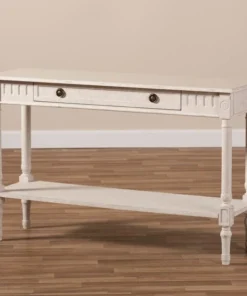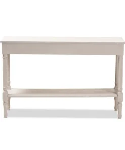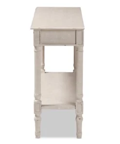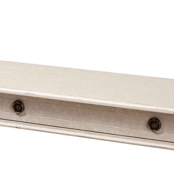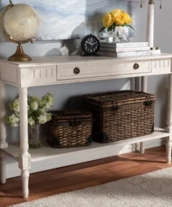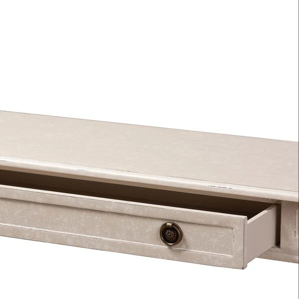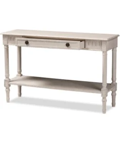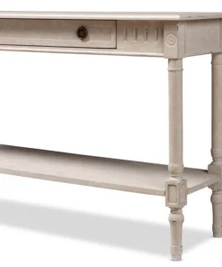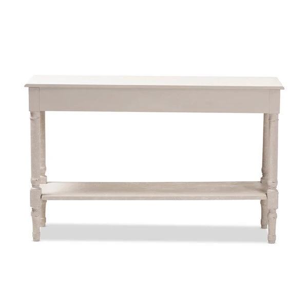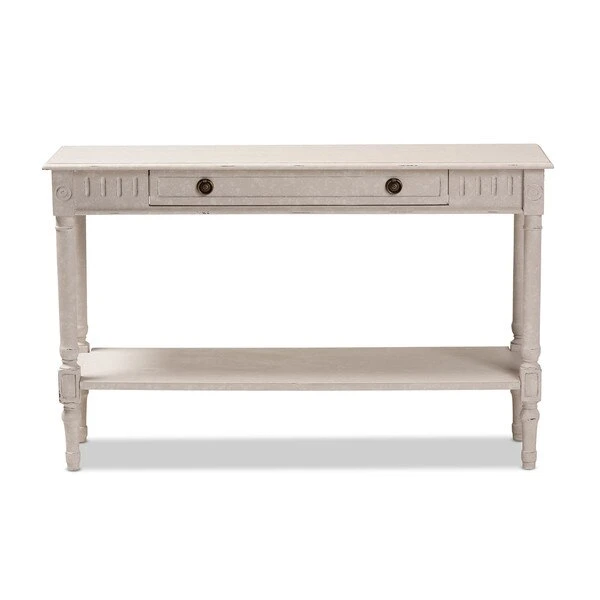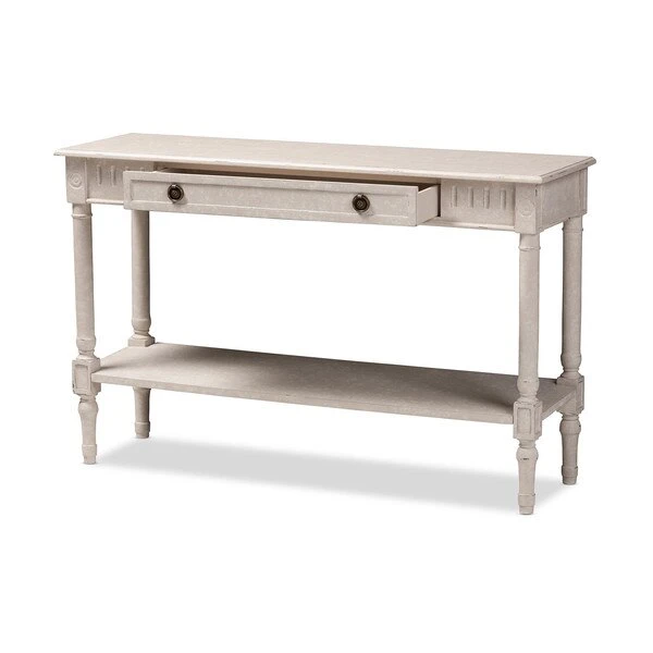 The ornate ball-turned details and the weathered look of the Ariella 1-drawer console table will add an element of romance and bygone times to your home. The country cottage farmhouse-inspired design is evident in the amount of detail put into this console table. The Ariella features one pull-out drawer and a bottom shelf for convenience. The whitewashed finish of the piece and charming, dark bronze finished drawer pulls give the console table a bit of antique style. The Ariella is easy to coordinate with a wide range of styles, including French, rustic, and provincial-inspired decor. Add the Ariella to your entryway or mudroom to delight visitors. The console table requires assembly.