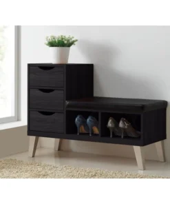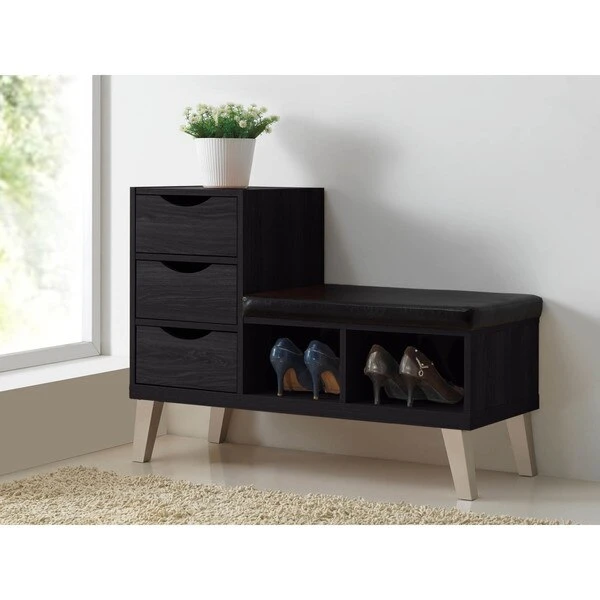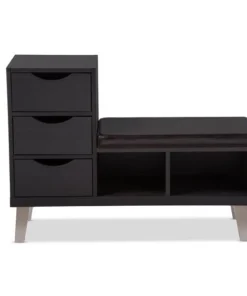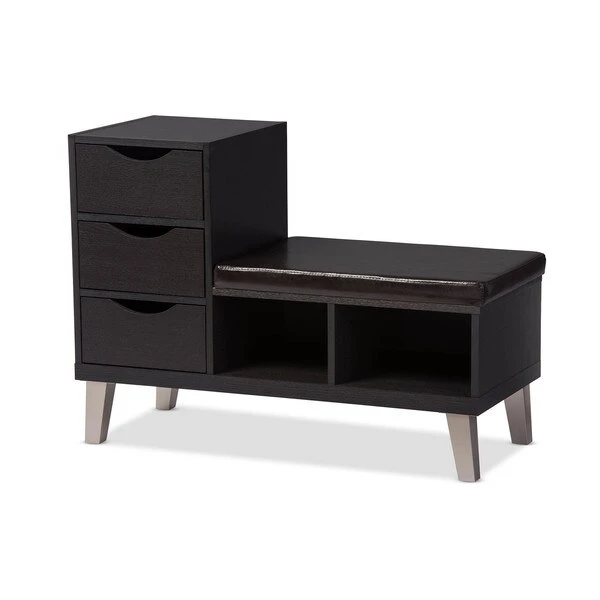 Simple and architectural, the Arielle 3-drawer Shoe Storage Padded Leatherette Seating Bench is reminiscent of modern and contemporary design. The Arielle’s clean and functional design features powder coated vinyl legs supporting the framework of the seating bench while providing storage drawers for hallway essentials. Three generous sized storage drawers and two open shelves are built in providing storage solution to keep your entryway or hallway clutter free. Crisp, clean lines and finger grooves drawers give the shoe bench an effortless character and charm. The shoe storage bench, constructed of engineered wood and finished in dark brown finishing will match with your modern interior decor. The Arielle bench, padded in foam and upholstered in faux leather, could be placed in your living room or entryway as shoe storage bench or seating bench. The Arielle requires assembly.