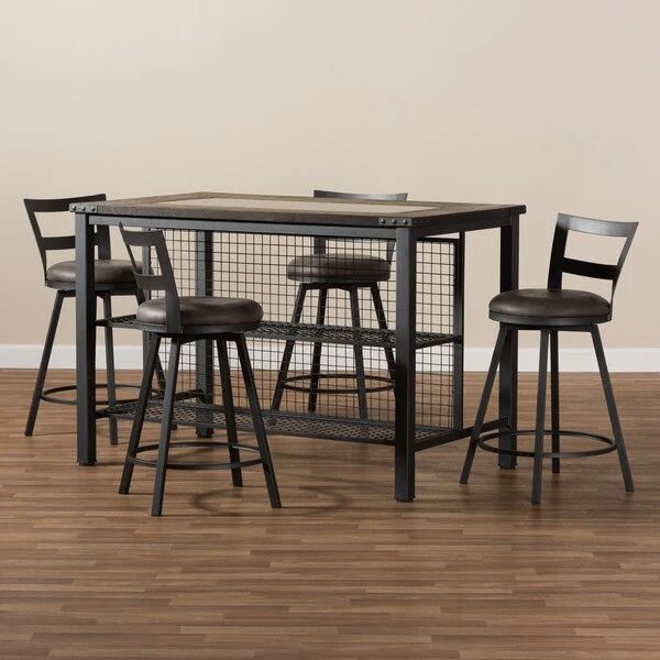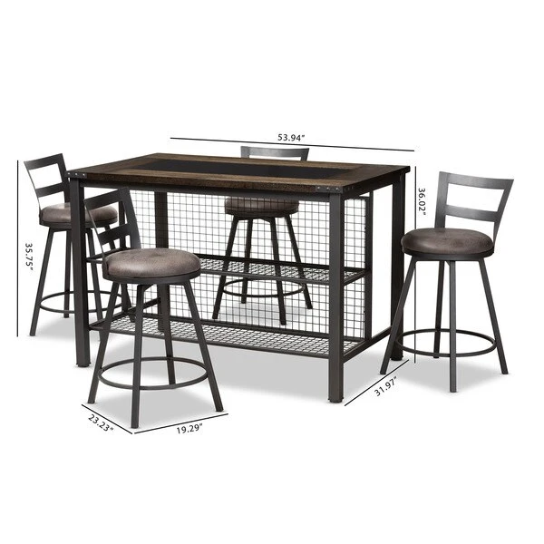 Add lasting style and charm to your space with the Arjean 5-piece pub set. The minimalist silhouette and neutral colorings are indicative of the set's rustic and industrial-inspired design. The Arjean's sturdy metal frame is finished in a matte antique silver. The pub stools feature circular, suede-like fabric upholstered seats with foam padding for hours of comfort. The chair backs of the Arjean are done in an open work design, which is slightly curved and winged. The table of the Arjean features two convenient wire shelves for display or storage, which is great for small spaces. The rectangular table top has a unique pattern, finished in black glass in the middle of the table, and framed by sturdy engineered wood finished with an ash veneer. This set will look right at home in your dining room or breakfast nook. The Arjean requires assembly.
