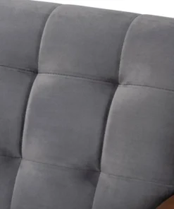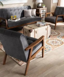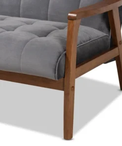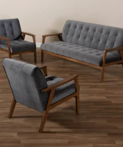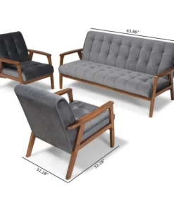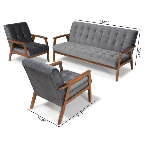 Declare your allegiance to timelessness with the Asta living room set. Constructed from solid rubberwood, the Asta set includes one sofa and two chairs. Each piece is upholstered in a soft, sumptuous grey velvet fabric that complements the walnut brown finish on the wood. Wide, plush cushions provide ample seating comfort, while biscuit tufting and angled legs lend a cool, retro look. Stylish and versatile, this set is well suited for both private living spaces and public reception areas. The Asta living room set requires assembly.