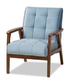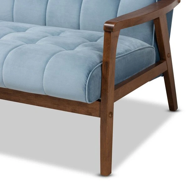 Declare your allegiance to timelessness with the Asta living room set. Constructed from solid rubberwood, the Asta set includes one sofa and two chairs. Each piece is upholstered a soft, sumptuous light blue velvet fabric that complements the walnut brown finish on the wood. Wide, plush cushions provide ample seating comfort, while biscuit tufting and angled legs lend a cool, retro look. Stylish and versatile, this set is well suited for both private living spaces and public reception areas. The Asta living room set requires assembly.