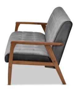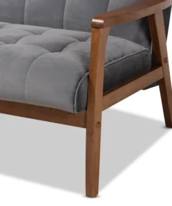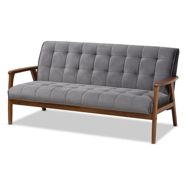 Declare your allegiance to timelessness with the Asta sofa. Constructed from solid rubberwood, the Asta showcases clean lines and a low profile. Soft, sumptuous grey velvet upholstery gives this sofa a distinctive look that pairs well with the walnut brown finish on the wood. Wide, plush cushions provide ample seating comfort, while biscuit tufting and angled legs lend a cool, retro feel. Stylish and versatile, this sofa is well suited for both private living spaces and public reception areas. The Asta sofa requires assembly.