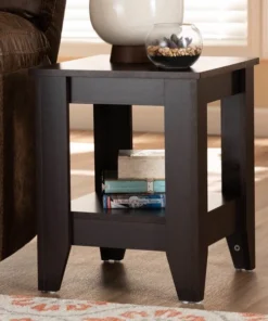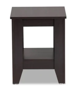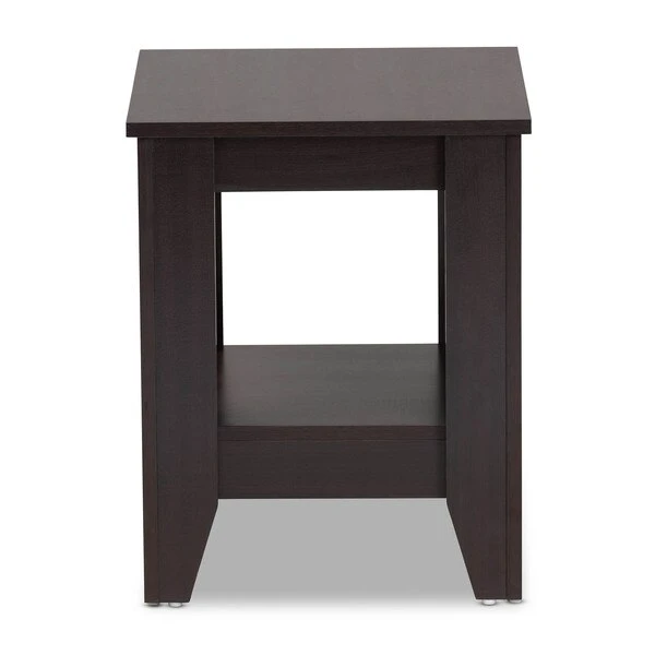 A clean, compact design makes the Audra end table a refined addition to any living space. Constructed from wood, the Audra features a dark brown finish that complements any color palette. The tabletop features space to place a lamp, while a lower shelf provides room to display books and decor. Tapered feet add an elegant look and are fitted with protector pads to prevent floor damage. The Audra end table requires assembly.