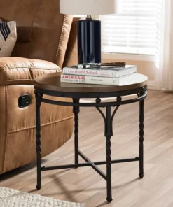 Inspired by vintage industrial design, the Austin antique bronze round shape end table features beautiful design with MDF wood top and solid metal iron base. The base features clean lines with classic detailing metal frame while the top boasts a round thick top with distressed wood finishing. Bold in scale and rich in character, it makes a dramatic backdrop for entertaining and display, a versatile living room table is perfect for family gatherings or game nights. The table requires assembly.