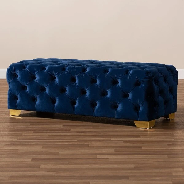 Add glamour to any space with the Avara ottoman. This plywood ottoman is upholstered in a sumptuous velvet fabric that displays a subtle sheen. All-over button tufting and lustrous gold-finished metal legs elevate the Avara to new heights of luxury. Place this stunning piece in the entryway or at the foot of the bed. The Avara bench ottoman will arrive fully assembled.