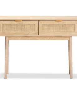 Add a retro inspired accent to your entryway with the stunning Baird console table. Made in China, the Baird is comprised of sturdy wood showcasing a light oak brown finish. Two drawers provide space to store keys and mail, while the wide tabletop offers room to display plants and decor. Requiring assembly, the console features woven rattan drawer faces and gold tone metal handles for eye catching style. A handy piece brimming with personality, the Baird console is sure to enhance any space.