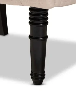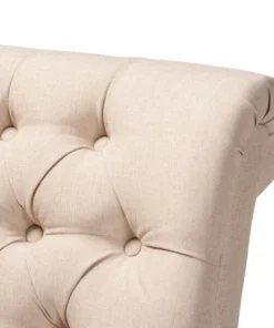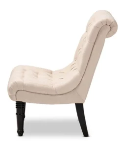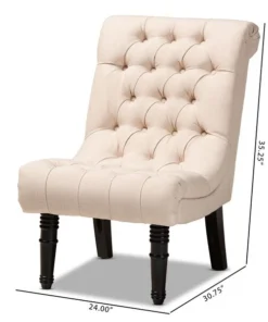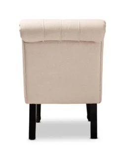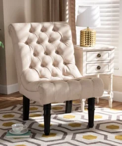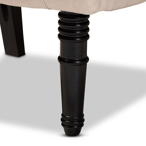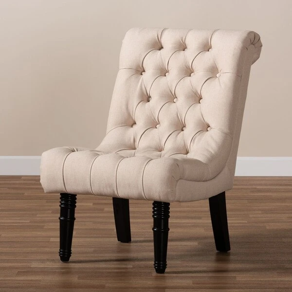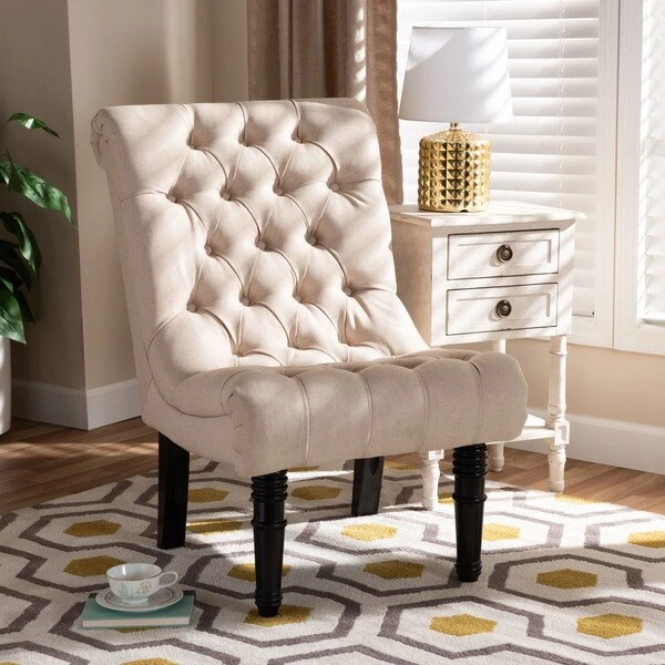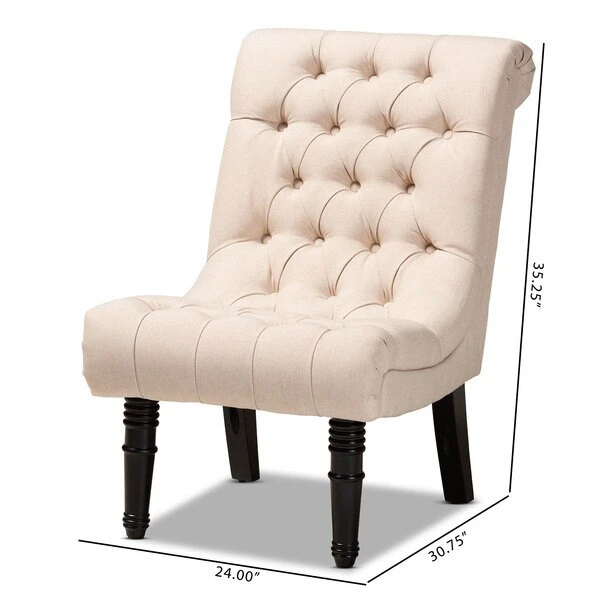 Showcasing a posh silhouette, the Barthe chair is sure to elevate the style of any living space. This dapper chair features a rolled back, providing both comfort and elegance. Striking attention to detail is evident in the button tufting on the seat and back, as well as the black ring turned legs. Constructed from sturdy eucalyptus wood, the Barthe is upholstered in a soft, durable linen polyester fabric. The Barthe chair will arrive fully assembled.