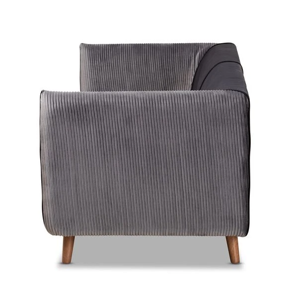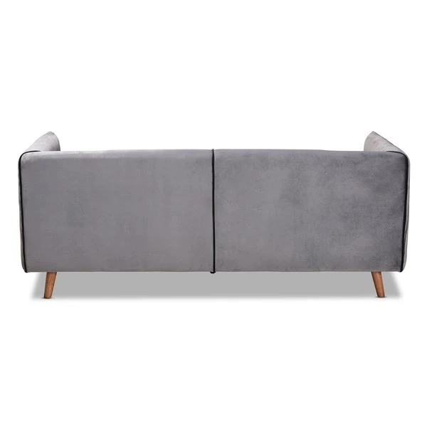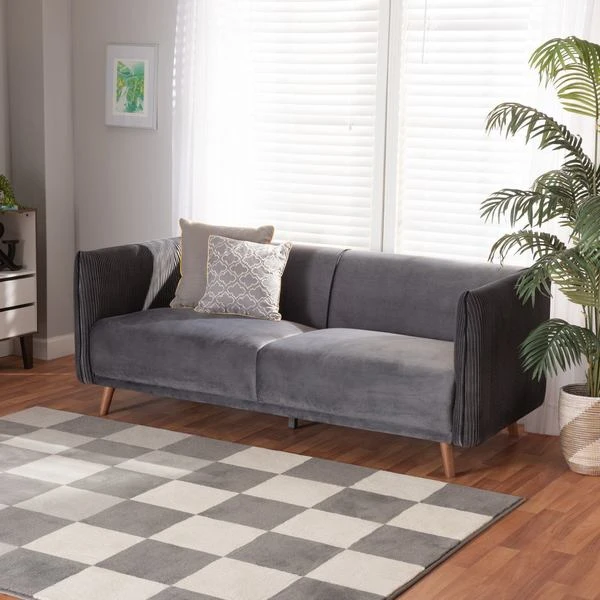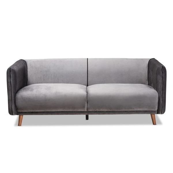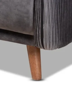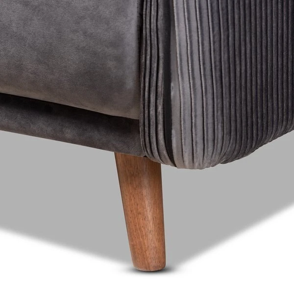 Lounge in luxurious comfort with the Beacher sofa. Made in Malaysia, the Beacher is comprised of a sturdy wood frame padded with thick layers of soft foam and upholstered in smooth velvet fabric. Channel tufted armrests add texture and depth while highlighting the vibrant hues of the grey velvet fabric. Requiring assembly, the Beacher is supported by angled legs showcasing a walnut brown finish for stable support with warm character. A visually stunning design and plush comfort distinguish the Beacher sofa as an exceptional addition to the modern home.