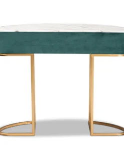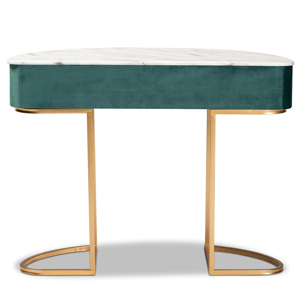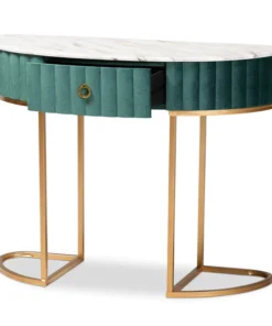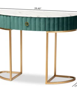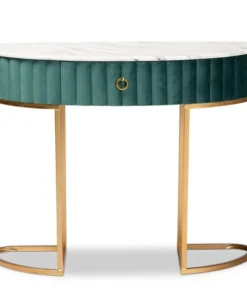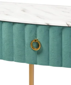 Add unique, glamorous charm to your space with the Beale console table. The Beale is comprised of a gold finished metal frame topped with a spacious faux marble tabletop for a luxurious aesthetic that also serves to declutter busy areas. One drawer provides storage space, while its slim frame makes it well suited for tighter spaces. A gold-tone ring pull adds an extra touch of glamour. Requiring assembly, the Beale is upholstered in green velvet fabric enhanced with alluring channel tufting. Instantly upgrade your entryway or hallway with the dazzling Beale console table.