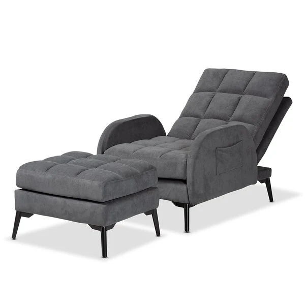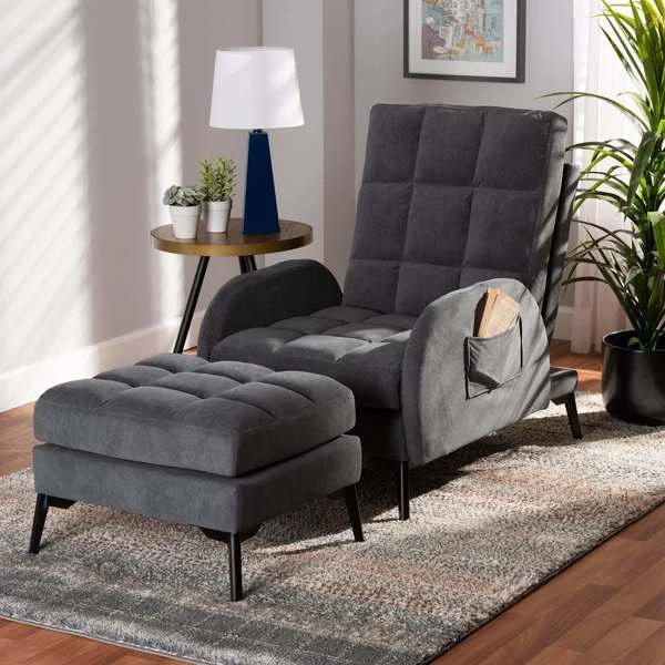 Give your home a cozy spot to relax and unwind with the Belden lounge chair and ottoman set. Made in China, this set includes one recliner chair and one ottoman comprised of sturdy wood frames padded with foam and upholstered in luscious velvet fabric. The cushions feature grid-tufting to provide plush comfort while showcasing contemporary style. Requiring assembly, the Belden chair reclines 9 degrees and features a handy storage pocket on the side of the chair for remotes, books, and more. With a sleek, contemporary design, the Belden lounge chair and ottoman set is sure to look right at home in any private setting.