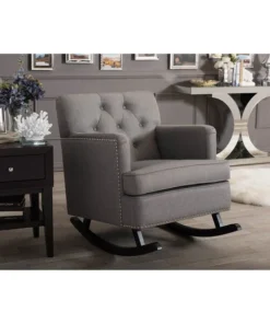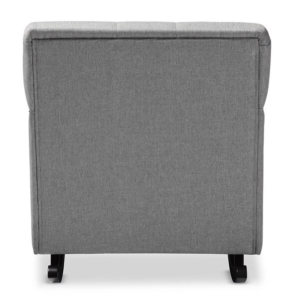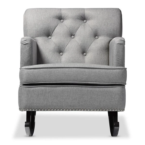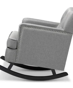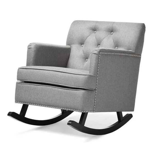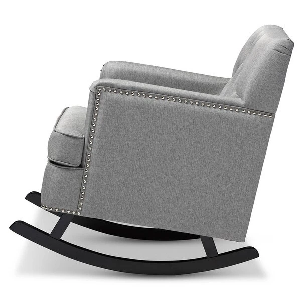 Contemporary rocking chair with modern design adds elegance and comfort into your residence. Bethany rocking chair can simply make a better relaxing space for you and your kids. Spending moment will be just interesting at high value of beauty and charm. Bethany rocking chair offers cushy armchair to become your reading nook or simple seating with sophistication and comfort. It has always been a popular addition for living room, that also interesting in featuring relaxing space in a bedroom. Featuring solid rubberwood in dark espresso brown matching with polyester fabric, the rocker is built to last. Button-tufting design and silver nail heads trim around the edges of the armrests and seat base add more charms to this piece. The Bethany looks smart, modern, but comfortable can be a good rocking chair for nursery during middle of the night feedings and yet a pretty piece of furniture to accent the room. The Bethany requires assembly.