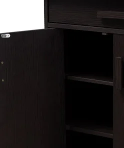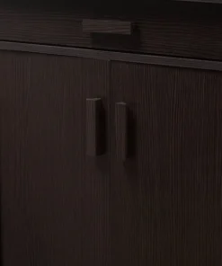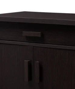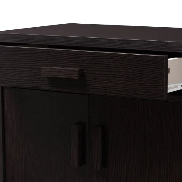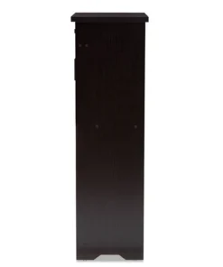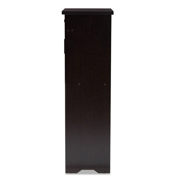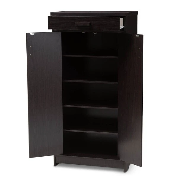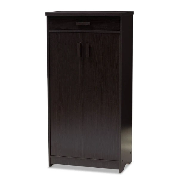 The Bienna shoe cabinet is the minimalist, simple storage solution you've been looking for. The modern and contemporary-inspired design is exemplified in this cabinet's straight, clean lines. The Bienna is finished in a wenge brown and with matching door handles, making it easy to coordinate with your existing decor. This tall shoe cabinet has one convenient top drawer that can serve as convenient place to put keys, mail, or serve as a catch-all drawer. The Bienna features five shelves discreetly placed behind two hinged doors with a magnetic closure, keeping clutter out of sight. This shoe cabinet has plenty of space to keep shoes, purses, or anything else that needs tidying up to keep your entryway or mudroom organized. The Bienna requires assembly.