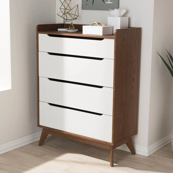 Brighton collection is a remake of a mid-century classic and bestseller, offering versatile storage with its drawers and shelf. Constructed of engineered wood and MDF, the Brighton 4-drawer storage chest is finished in white and walnut veneer for lasting good looks, suiting interiors from Scandinavian to contemporary. Featuring drawers with cut-out handles for a sleek and clean look, the Brighton provides storage solution for your clothes, lingerie's, linen and your bedroom essentials. Practical top shelf surface allows you to decorate with flowers, photo frames and as an additional spot for books. Angular legs, for Scandinavian vibes in your space complete the look. The Brighton 4-drawer chest requires assembly.