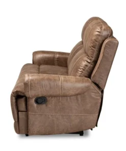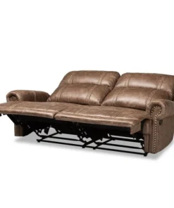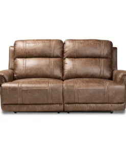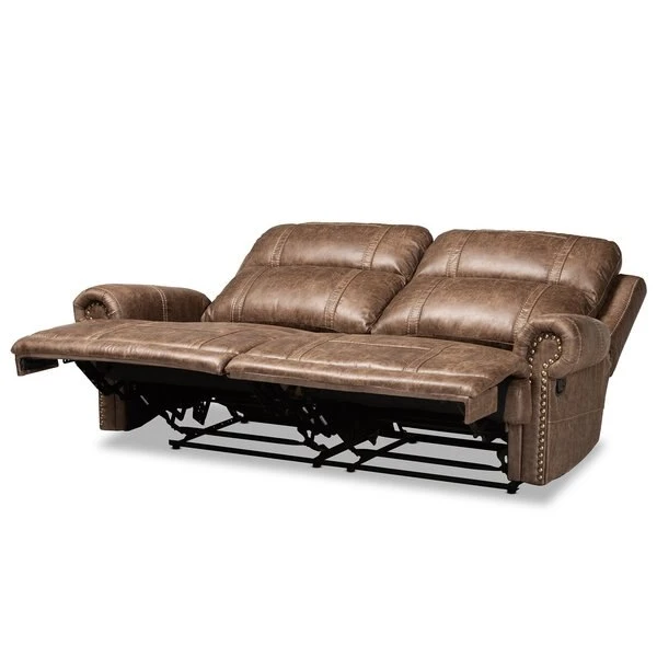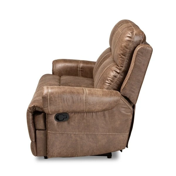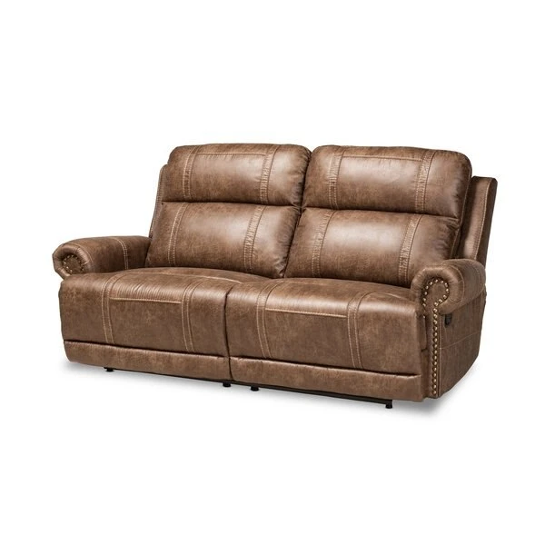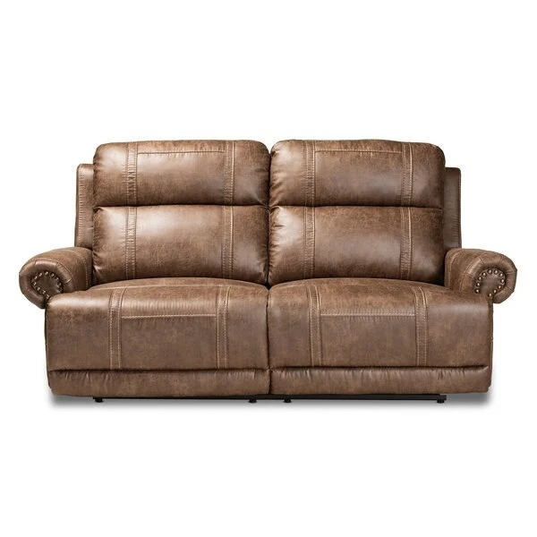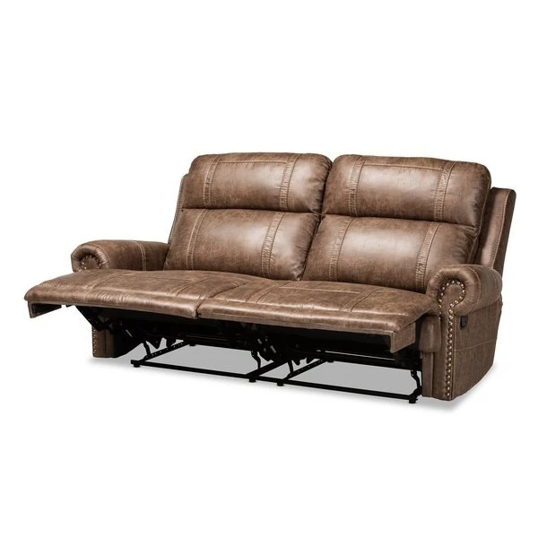 Renew your living room with the smooth comfort and classic design of the Buckley sofa. Made in China, the Buckley is comprised of a sturdy metal and wood frame padded with thick layers of soft foam and upholstered in smooth faux leather. Wide, reclining seats provide cozy comfort, while plush backrests ensure superb support. Requiring assembly, the Buckley is accented with brass finished nailheads for a touch of contemporary glamour. Stylish contrast stitching adds personality, making the Buckley sofa an exceptional addition to the modern home.
