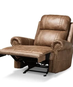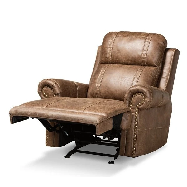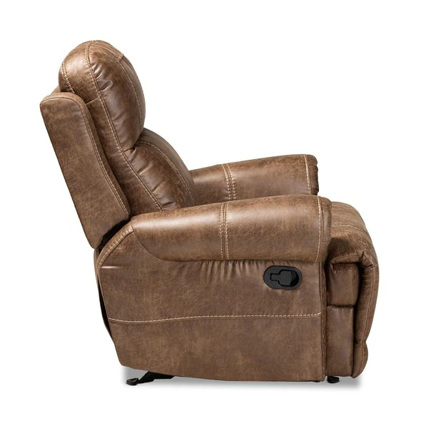 Renew your living room with the smooth comfort and classic design of the Buckley recliner. Made in China, the Buckley is comprised of a sturdy metal and wood frame padded with thick layers of soft foam and upholstered in smooth faux leather. A wide, reclining seat provides cozy comfort, while the plush backrest ensures superb support. Requiring assembly, the Buckley is accented with brass finished nailheads for a touch of contemporary glamour. Stylish contrast stitching adds personality, making the Buckley recliner an exceptional addition to the modern home.