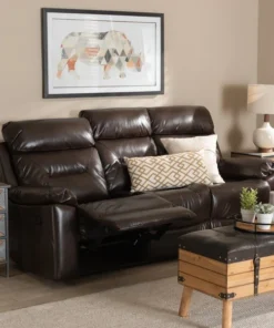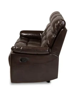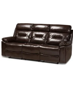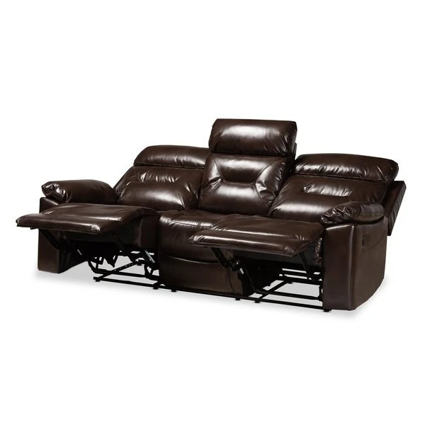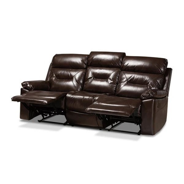 Modern style combines with plush, supportive comfort to create the stunning Byron sofa. Made in China, the Byron is comprised of a sturdy metal and wood frame padded with thick layers of soft foam and upholstered in smooth faux leather. Wide seats encourage cozy relaxation, while geometric stitching on the backrests add texture and depth. Requiring assembly, the side seats recline with a convenient lever located on each side of the sofa. The middle seat is fixed. The modern silhouette and soothing embrace of the Byron sofa make it an excellent addition to any living space.