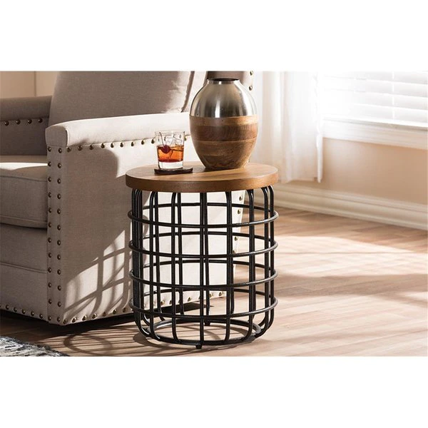 Perfect for introducing an industrial accent to your living area. The Carie is crafted from a bold. interlacing metal frame and distressed oak veneered wood top. This side table may be smaller in size. but it is powerful in design. This table will be an eye-catching addition to your urban loft or contemporary bedroom. . the Carie requires assembly. FeaturesIndustrial rustic style end tableAntiqued bronze finishing powder coated metalDistressed oak veneersAssembly requiredSet Includes:One 1 End TableCare Instruction:Wipe with a dry clothDimension:Dimensions: 17" High x 15.7" Wide x 15.7" DeepSpecificationsColor: Brown & BlackStyle: IndustrialComposition: MDF. MetalOutdoor Use: NoAssembly Required: YesWarranty: 30 Day LimitedWeight: 11.68 lbs
