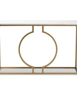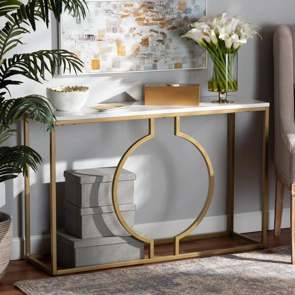 Add stunning, contemporary charm to your space with the Caldwell console table. The console is comprised of a gold finished metal frame and a rectangular faux marble tabletop. The base features a striking geometric design that is sure to make this a distinguished piece in any space. Requiring assembly, the Caldwell is fitted with black non-marking feet for easy transport and rearrangement. Instantly upgrade your entryway or living room with the glamorous style of the Caldwell console table.