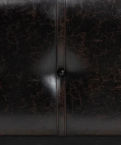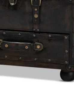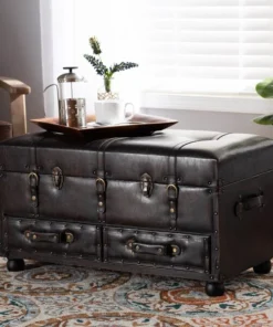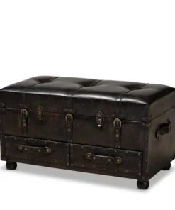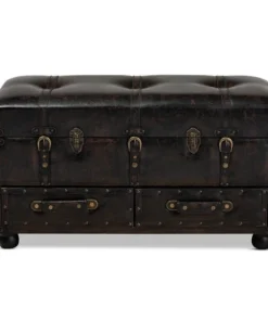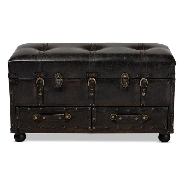 Stylish and versatile, the Callum ottoman is an easy addition to any space. Set on top of black bun feet, the Callum is upholstered in a distressed dark brown faux leather for an authentic antique look. Ample storage space is located beneath the cushioned lift-up lid, as well as in two drawers situated at the bottom. Inspired by vintage steamer trunks, the Callum is accented with antique brass buckles and latches. Antique bronze nailheads and button tufting add an extra dose of style. The Callum ottoman will arrive fully assembled.