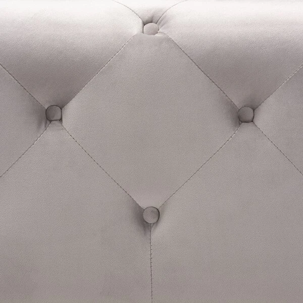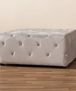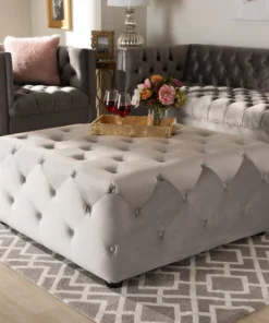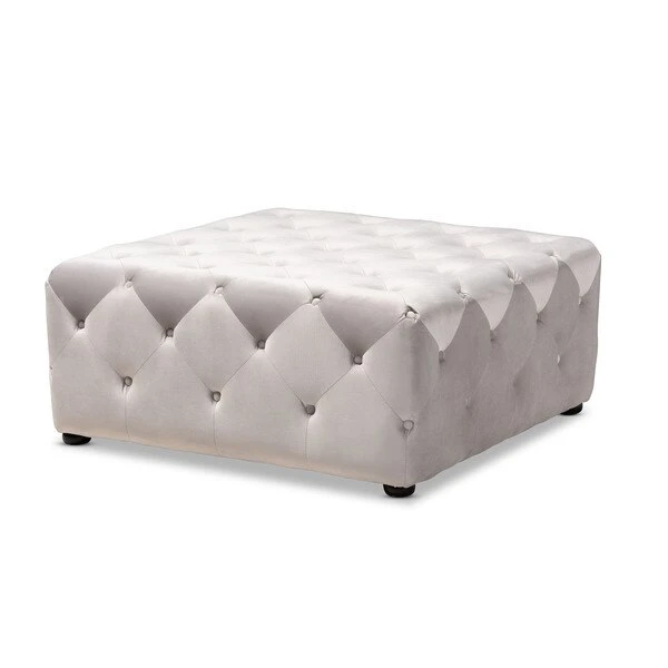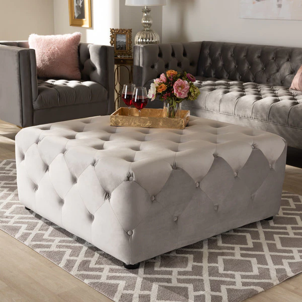 Elevate your living room with the beauty and versatility of the Calvetti ottoman. Constructed from eucalyptus wood, the Calvetti is upholstered in a soft, sumptuous velvet fabric. All-over button tufting accentuates the subtle sheen in the velvet, while round black-finished legs provide elevation. Use this versatile piece as a coffee table, footstool, or as extra seating for guests. The Calvetti ottoman will arrive fully assembled.