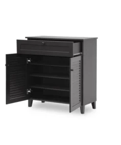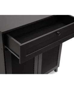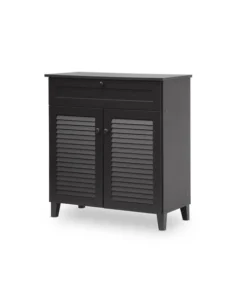 No need to force your shoe collection into an inconvenient location thanks to our Calvin Espresso Shoe-Storage Cabinet. This completely contemporary cabinet features four shelves with space to spare plus a top drawer for even more storage. Slatted front doors include sturdy solid-wood handles and the espresso finish and wedge-shaped feet look fabulous.