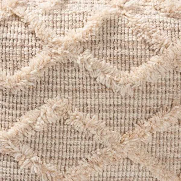 Add a sophisticated touch to your interior with the exquisite Carilyn pouf ottoman. Handwoven in India, this pouf is made from wool and cotton. Brilliant ivory threads create a neutral color palette that blends well with a wide range of room layouts and styles. A lovely diamond pattern adorns each side of the Carilyn for a graceful display from any angle. Serving as a cozy footstool or as an extra seat, the Carilyn pouf ottoman lends an elegant touch to any space.