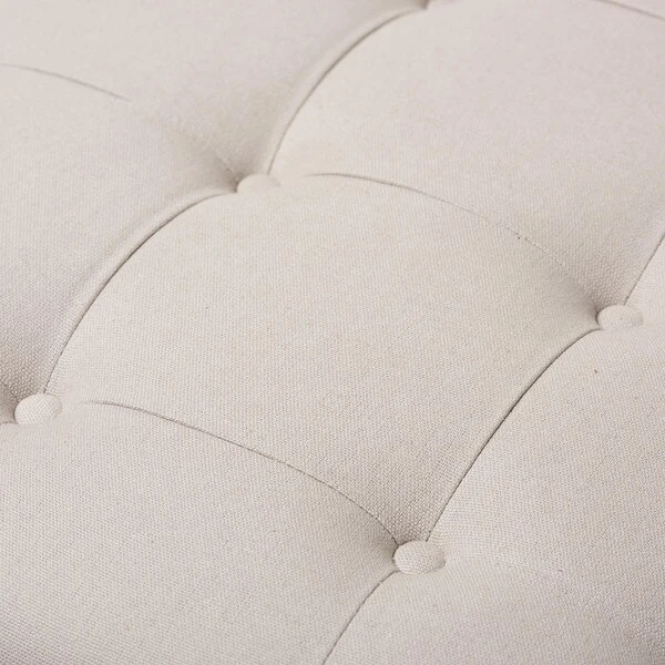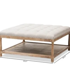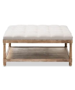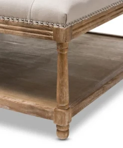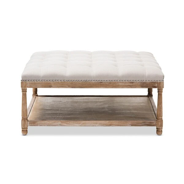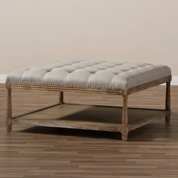 Like any good classic, the Carlotta effortlessly teams style with functionality while proving its versatility as a footstool and coffee table with storage unit. Inspired by French Provincial design, the Carlotta features intricate tufted detailing and carved woodwork. The coffee table ottoman is as practical as it is pretty, featuring a plush comfortable seat with buttons and lower shelf for storage. Silver nail heads detailing gives the piece a contemporary appeal while a medium density foam filling ensures ultimate comfort. Ideal as a footstool or coffee table, the Carlotta is built with a solid oak frame. The weathered finishing adds a rustic touch and completes the look. The Carlotta will arrive fully assembled.