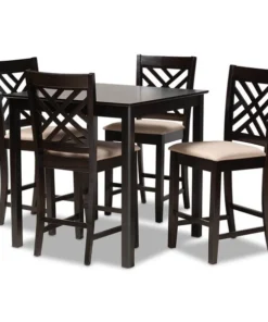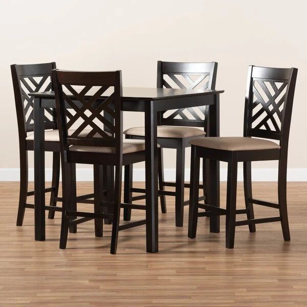 Redefine your dining space with the elegance and comfort of the Caron 5-piece pub set. Constructed from wood, this pub set includes one table and four chairs, each upholstered in a light polyester fabric that complements the rich espresso wood finish. Designed with both comfort and style in mind, each chair features a plush foam-padded seat, as well as an exquisite cut-out design on its back. The compact size of the Caron set makes it well suited for dining rooms and kitchens with limited space. The Caron 5-piece pub set requires assembly.