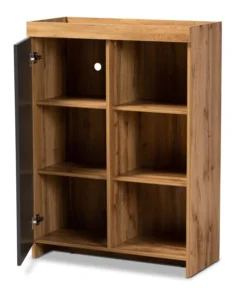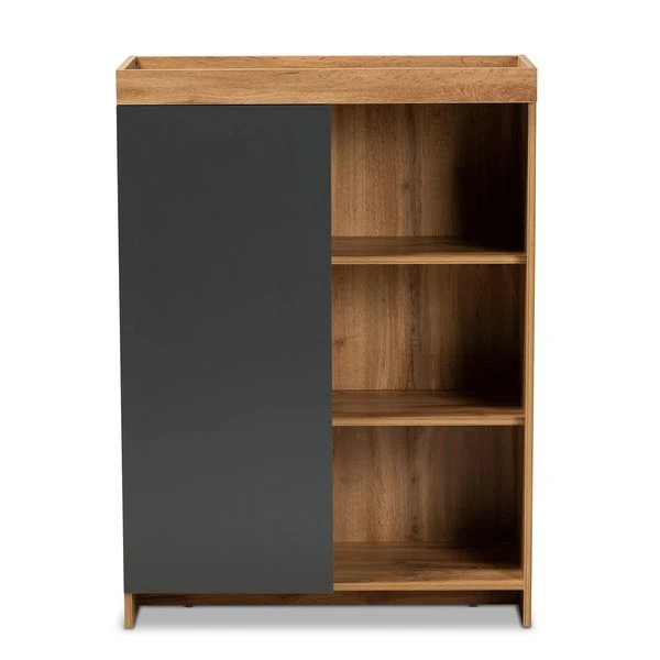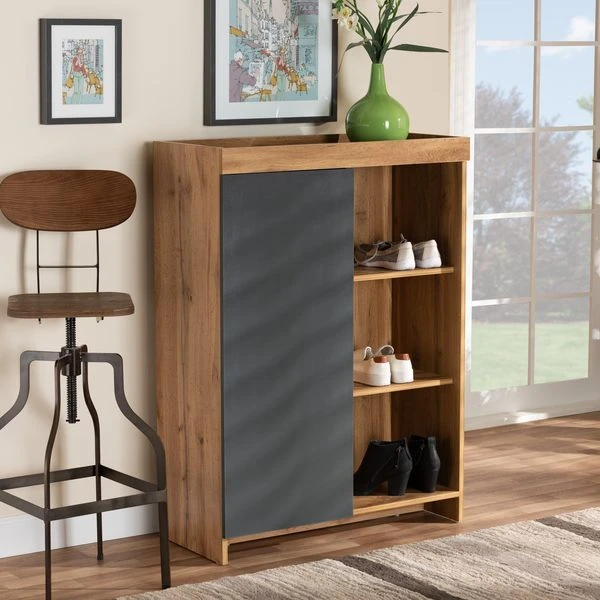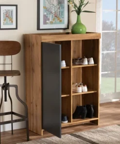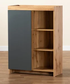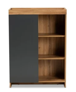Create an eye catching display in your entryway with the stunning Caspian shoe cabinet. Made in Malaysia, the Caspian is constructed from sturdy wood showcasing a two-tone grey and oak brown finish for a cool, modern look. Three open shelves and three additional shelves behind the door are capable of supporting around 12 pairs of shoes, depending on size. Requiring assembly, the Caspian features an inset tabletop that provides a protective barrier for decorative items. An excellent blend of utility and style, the Caspian shoe cabinet upgrades any space.