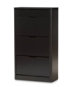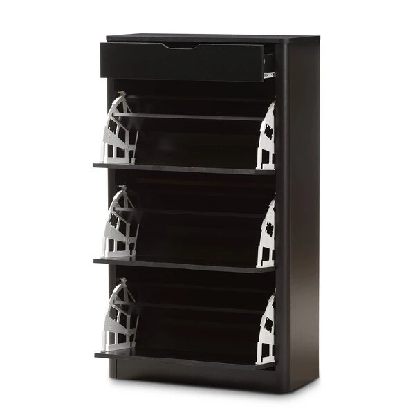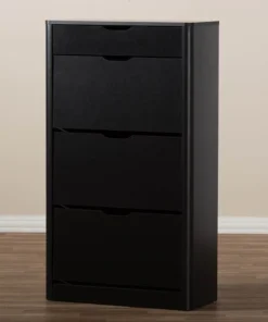 Update your everyday organization with the smart design and spacious drawers of the Cayla black shoe cabinet. Constructed of durable engineered wood for a sturdy structure with black finish for lasting good looks, the Cayla features soft-forming side panels outlook for a contemporary feel. One drawer space at the top is ideal for storing spare knick-knacks, deodorizers, and shoe-shine polishes. Three drawers with fold-down doors reveal angled compartments to easily access your shoes. Store up to 12 pairs of shoes for your convenience. Perfect for your entrance or bedroom for keeping sneakers, heels, and flats under wraps. The Cayla requires assembly.