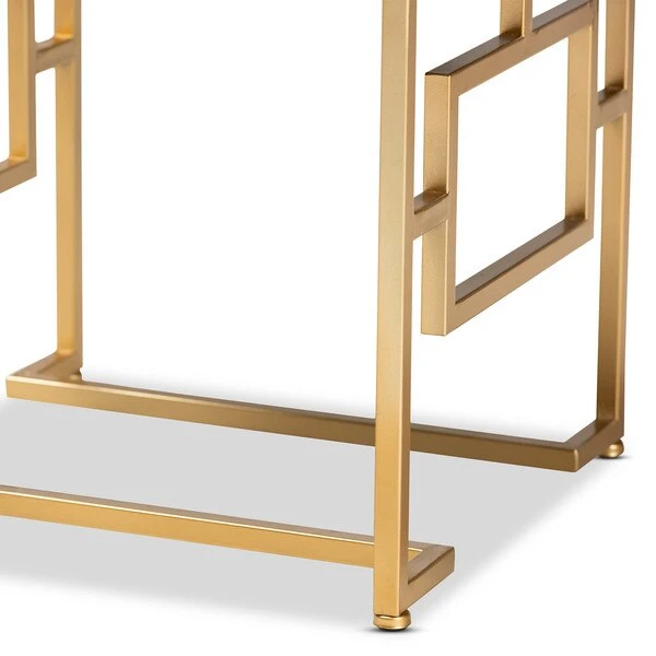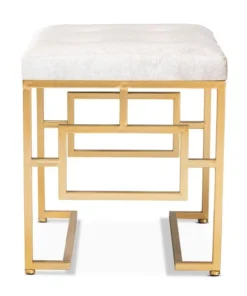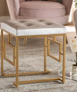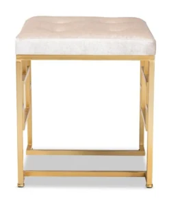Bring the glamour of the 1920s to your space with the Cecile ottoman. This metal ottoman features a striking gold-toned geometric base that provides a light, airy feel. The seat is upholstered in an elegant beige velvet fabric and is button tufted to highlight the stunning sheen in the velvet. Use this glamorous ottoman as a vanity seat or as a footstool. The Cecile ottoman will arrive fully assembled.