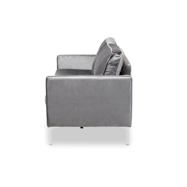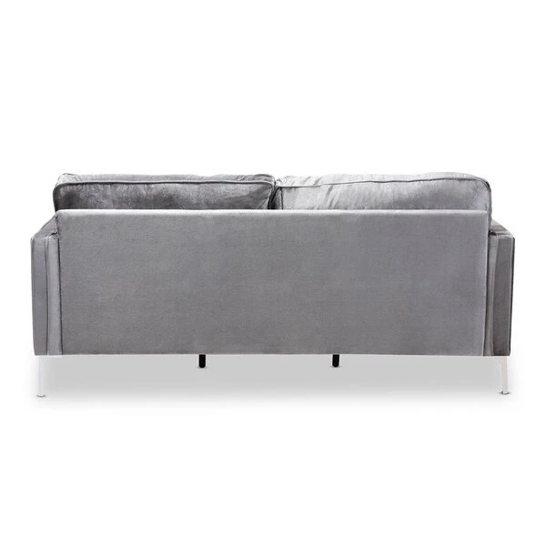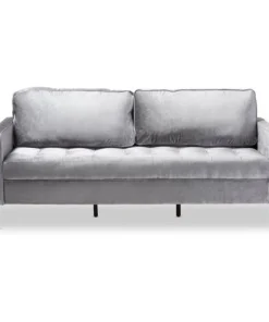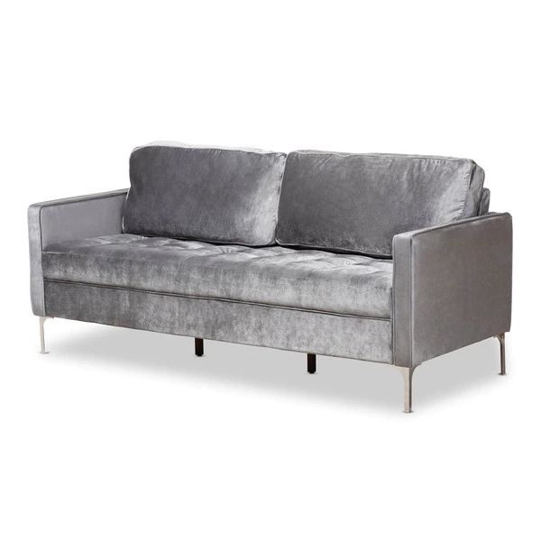 With its clean lines, metal legs and tufted design, the Clara sofa wouldn’t have looked out of place in a 1950s modernist home – and still looks fresh today. Slim arms accented with a piping trim showcase a modern look, while deep seat cushions and high back cushions provide a comfortable seating experience. Constructed from solid rubberwood and MDF wood, the Clara is built to last. Grey velvet fabric upholstery is soft to the touch and easy to coordinate with any color palette. The Clara sofa requires assembly.