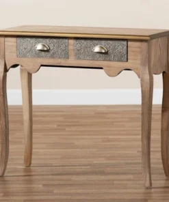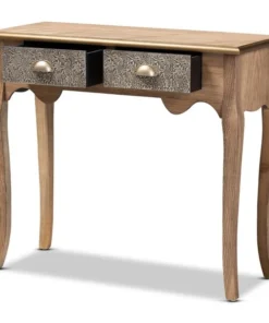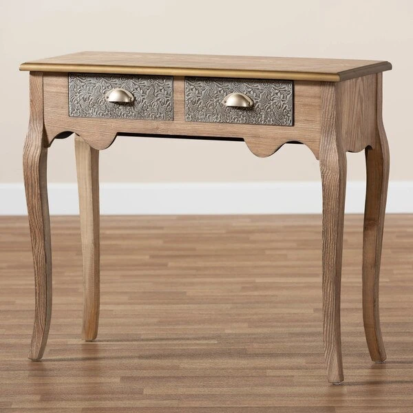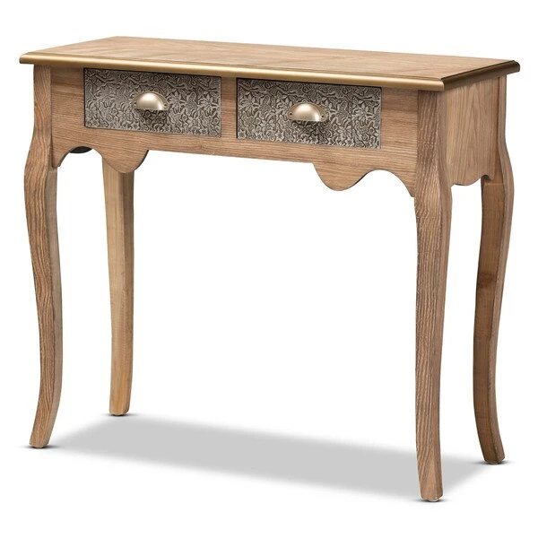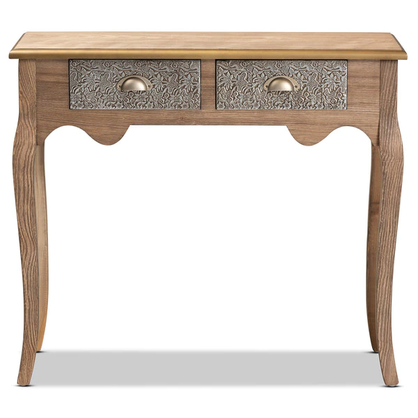 Keep your entryway or living room organized in the most charming way with the Clarice console table. Inspired by classic French furniture silhouettes, this wood table features long, elegant cabriole legs. Storage space is provided by two metal drawers, ideal for storing keys, chargers, and more. Striking attention to detail is displayed on the drawers, which are embossed with intricate floral motifs, as well as on the gold-finished edges of the tabletop. Its slim silhouette makes it well suited for placement in a hallway, entryway, or living room. The Clarice console table requires assembly.