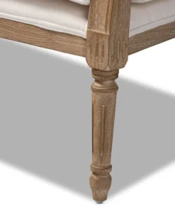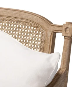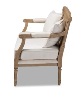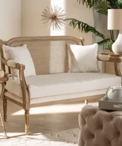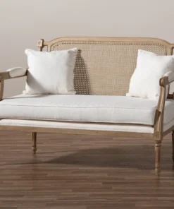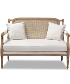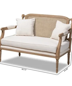 Fit for the home of a French aristocrat, the Clemence loveseat adds elegance to any room. Constructed from solid mahogany wood, the Clemence displays a natural white-washed finish for an antique look. Stunning craftsmanship is shown on the intricately carved frame, as well as the woven rattan back. Designed to add both beauty and comfort to your space, the Clemence is upholstered in an elegant ivory fabric and features thick foam padding on the seat and armrests. Two matching accent pillows complete the look. The Clemence loveseat requires assembly.
