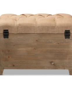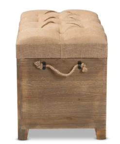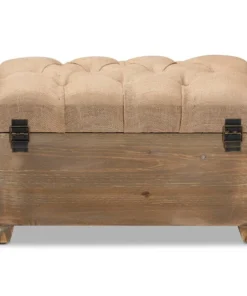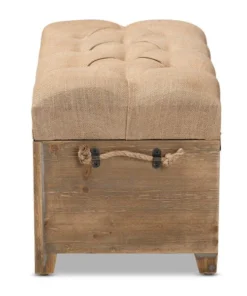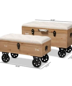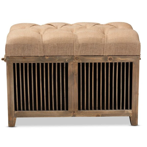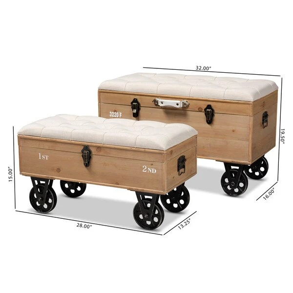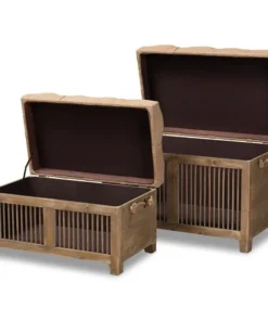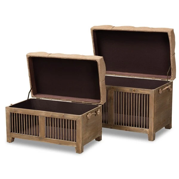 Rustic tones and clean lines make the Clement ottoman set a handsome addition to any room. Including one large ottoman and one small ottoman, this sturdy wood set displays a medium oak finish that highlights the wood grains for a cozy, rustic look. The beige linen-blend fabric upholstered seat complements the wood finish and can be flipped up to reveal a spacious storage compartment. Its traditional spindle design exposes the storage inside, adding an element of interest to your space. Hemp rope handles provide a touch of farmhouse charm, while antique brass rivet tufting lends a touch of glamour. The Clement ottoman set will arrive fully assembled.