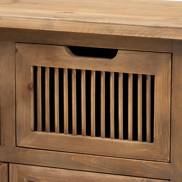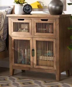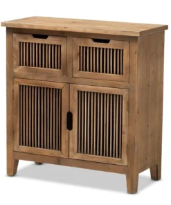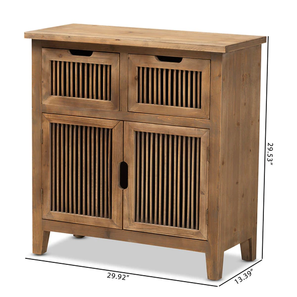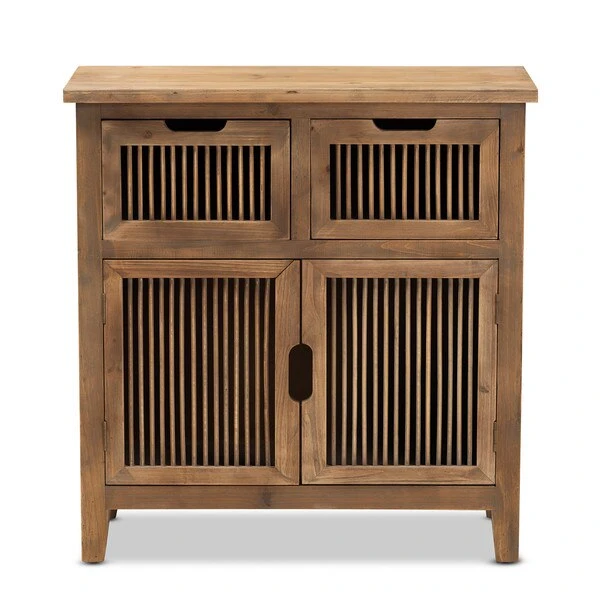 Rustic tones and clean lines make the Clement cabinet a handsome addition to any space. This sturdy wood cabinet displays a medium oak finish that highlights the wood grains for a cozy, rustic look. One storage compartment, behind a pair of doors, provides ample space to store books or display trinkets. Two drawers provide additional storage space. Spindle detailing lends visual interest, while cut-out door handles enhance the cabinet’s natural appeal. The Clement cabinet will arrive fully assembled.