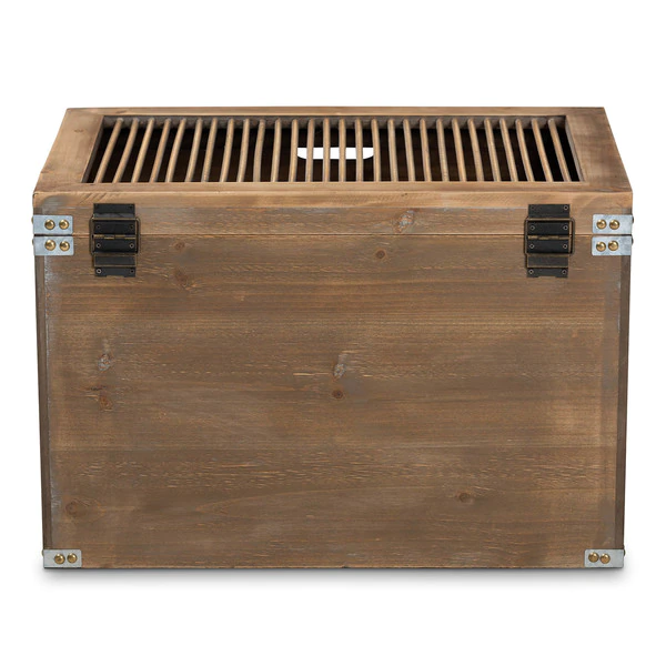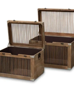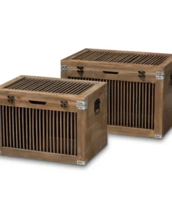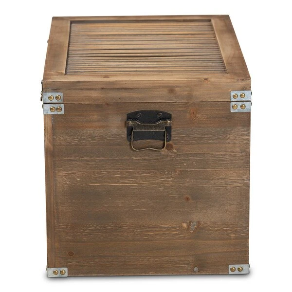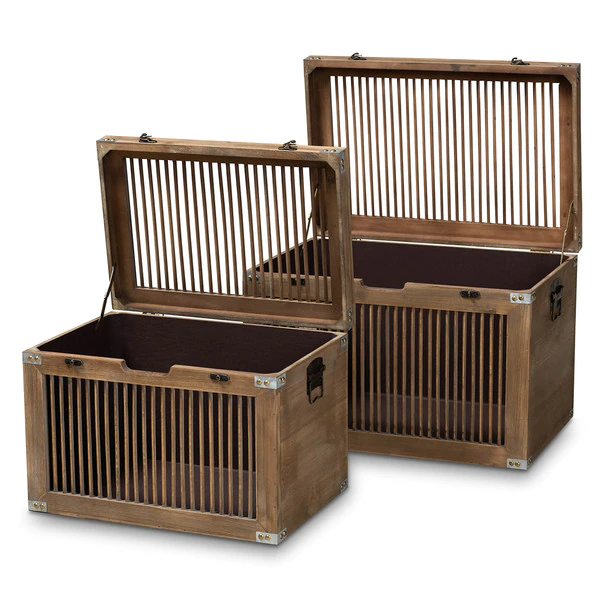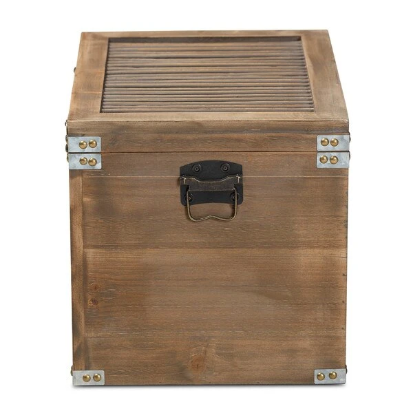 Rustic tones and clean lines make the Clement trunk set a handsome addition to any space. This sturdy wood set displays a medium oak finish that highlights the wood grains for a cozy, rustic look. Each piece features an inner storage compartment, ideal for storing extra blankets and pillows. Spindle detailing lends visual interest, while antique brass clasps and rivets provide a vintage steamer trunk-inspired feel. The clement set will arrive fully assembled.