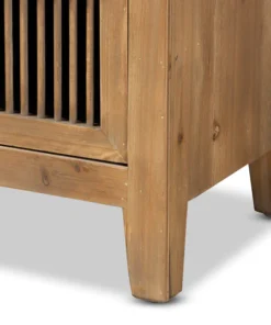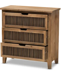 Rustic tones and clean lines make the Clement chest a handsome addition to any space. This sturdy wood chest displays a medium oak finish that highlights the wood grains for a cozy, rustic look. Three drawers provide space to store linens or display trinkets. Spindle detailing lends visual interest, while cut-out door handles enhance the chest’s natural appeal. The Clement chest will arrive fully assembled.