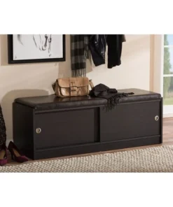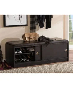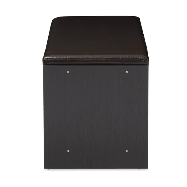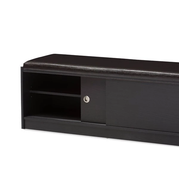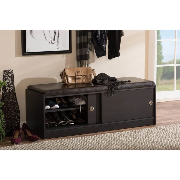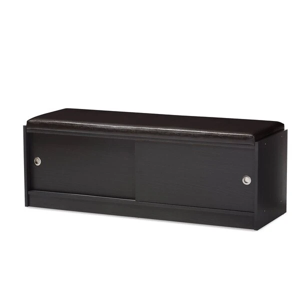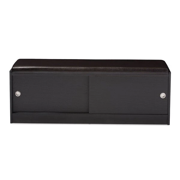 This entryway bench combines style and function and it'll effortlessly blend into any space and really help clear your space of those messy piles of shoes that everyone always trips over. This unique seating bench features two storage compartments behind the sliding doors and a faux leather cushion top for comfortable seating. This solid piece is constructed of engineered wood in dark brown PU veneer. To add more functionality, you can use the faux leather storage bench ottoman in the living room for a place to rest your feet as you watch TV or read a book. The interior can be used to hold magazines, newspapers, remotes or other electronic devices. This lovely piece can also be used as extra seating, when needed. The seating shoes storage bench requires assembly.
