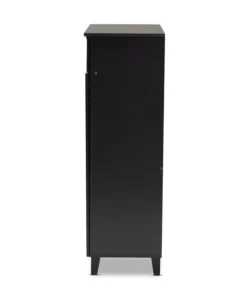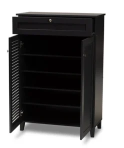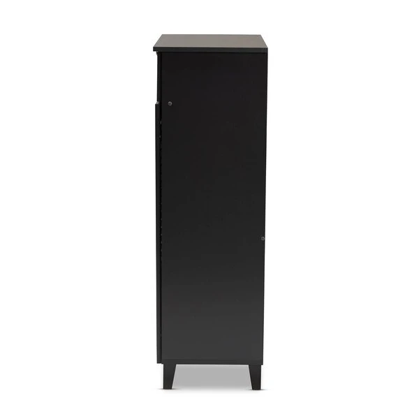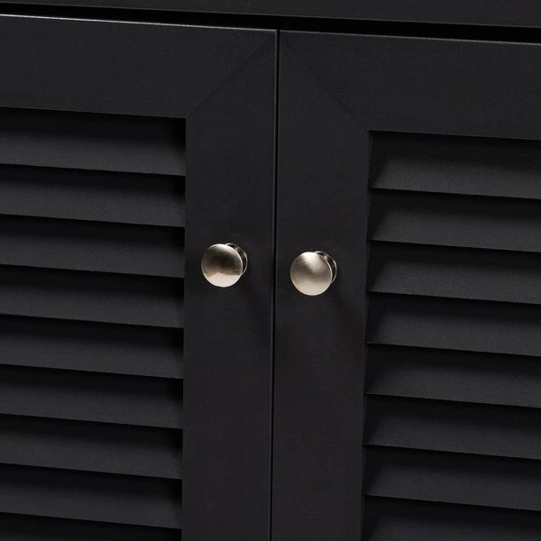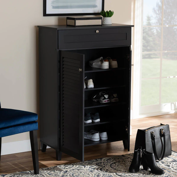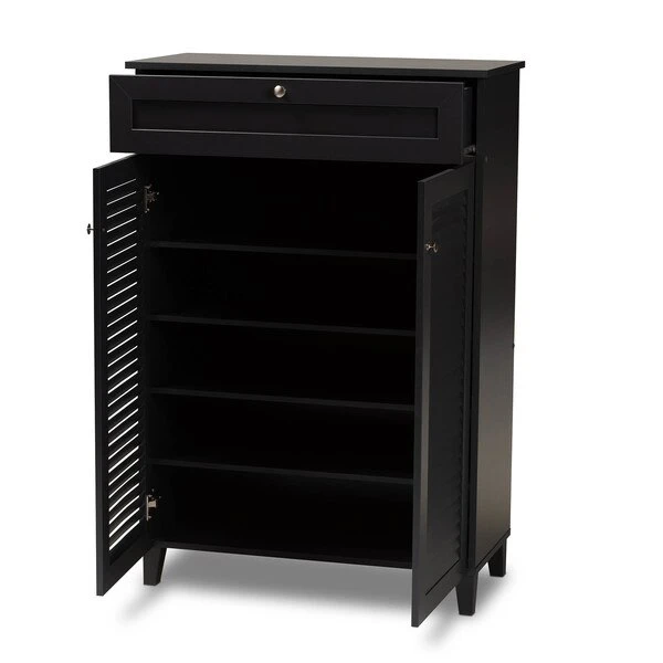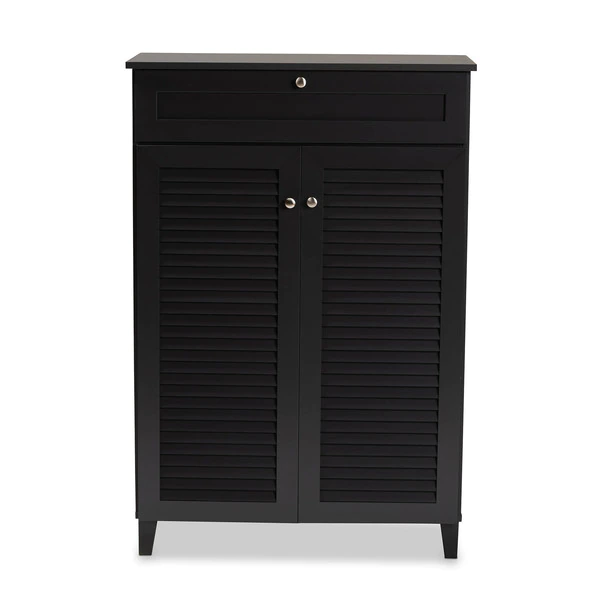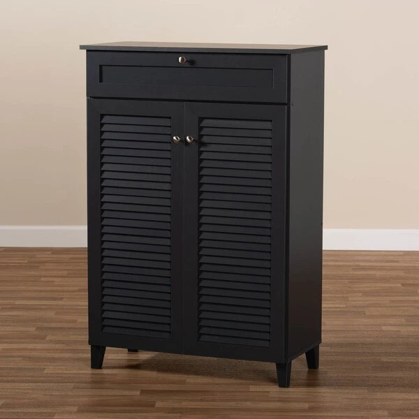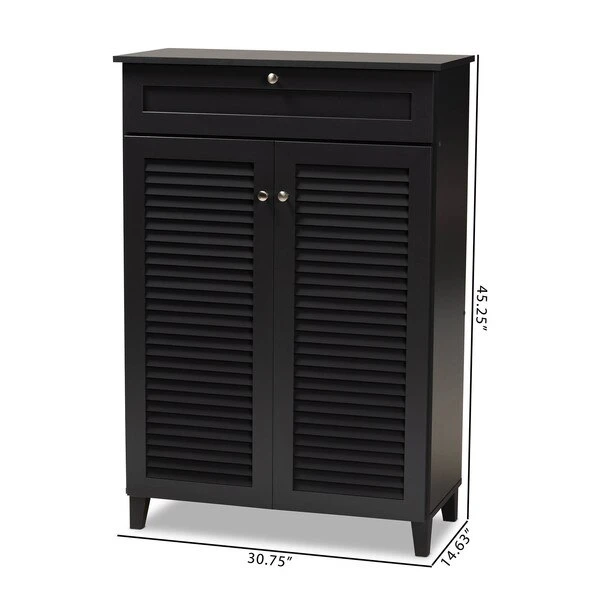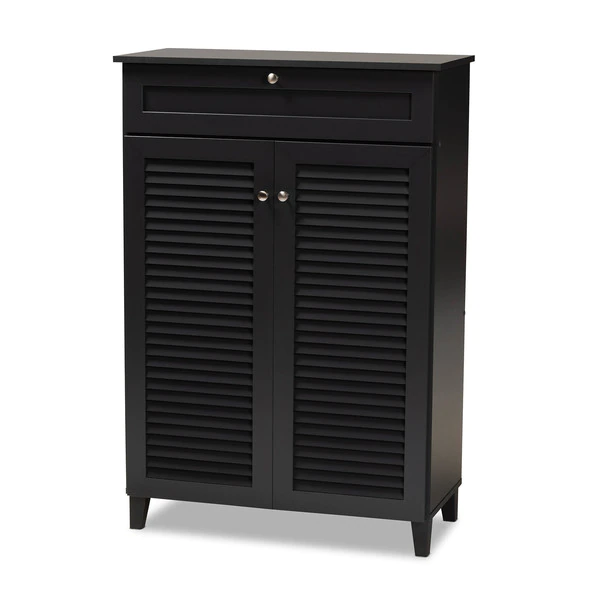 Store your shoes on the sly with the Coolidge shoe cabinet. Two slatted doors, fitted with round knobs, conceal five shelves with storage space for up to 15 pairs of shoes. One spacious drawer, accented with inset paneling, provides additional storage space for extra shoelaces and miscellaneous items. Tapered legs add refined style and provide elevation to deter dust buildup. Constructed from engineered wood, the Coolidge showcases a sleek dark grey finish that complements any color scheme. The Coolidge shoe cabinet requires assembly.