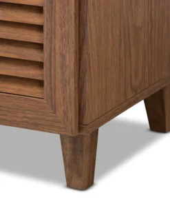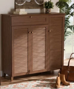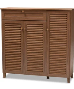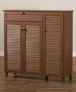 Store your shoes on the sly with the Coolidge shoe cabinet. Three slatted doors, fitted with round knobs, conceal 11 shelves with storage space for up to 21 pairs of shoes. One spacious drawer, accented with inset paneling, provides additional storage space for extra shoelaces and miscellaneous items. Tapered legs add refined style and provide elevation to deter dust buildup. Constructed from engineered wood, the Coolidge showcases a classic walnut brown finish that complements any color scheme. The Coolidge shoe cabinet requires assembly.