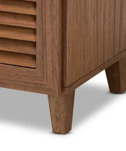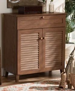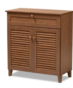 Store your shoes on the sly with the Coolidge shoe cabinet. Two slatted doors, fitted with round knobs, conceal four shelves with storage space for up to 12 pairs of shoes. One spacious drawer, accented with inset paneling, provides additional storage space for extra shoelaces and miscellaneous items. Tapered legs add refined style and provide elevation to deter dust buildup. Constructed from engineered wood, the Coolidge showcases a classic walnut brown finish that complements any color scheme. The Coolidge shoe cabinet requires assembly.