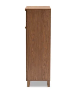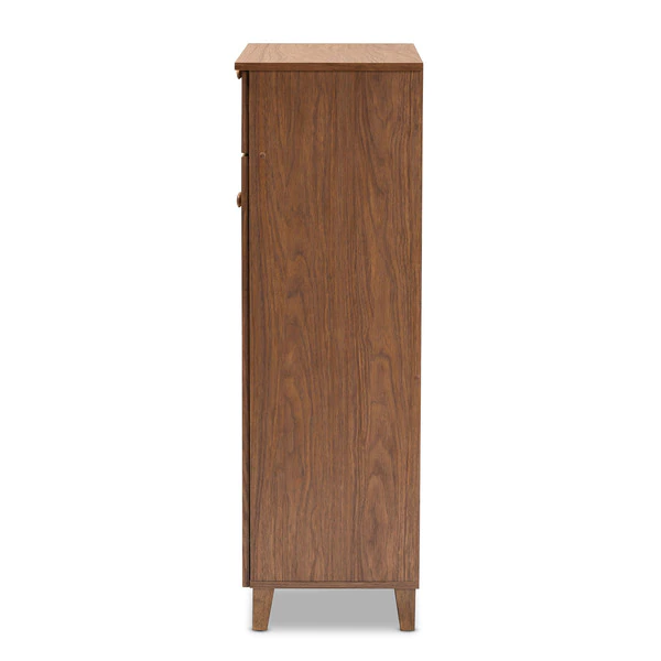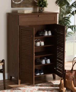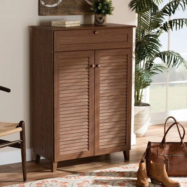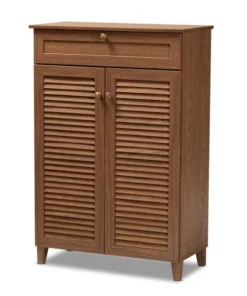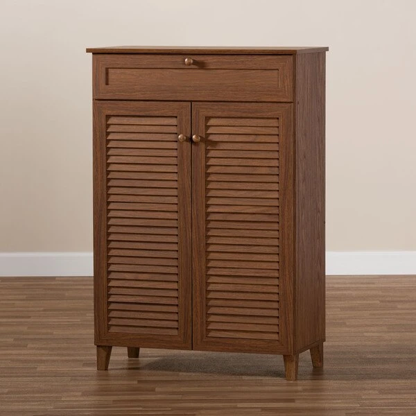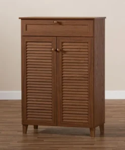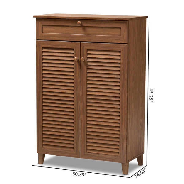 Store your shoes on the sly with the Coolidge shoe cabinet. Two slatted doors, fitted with round knobs, conceal five shelves with storage space for up to 15 pairs of shoes. One spacious drawer, accented with inset paneling, provides additional storage space for extra shoelaces and miscellaneous items. Tapered legs add refined style and provide elevation to deter dust buildup. Constructed from engineered wood, the Coolidge showcases a classic walnut brown finish that complements any color scheme. The Coolidge shoe cabinet requires assembly.