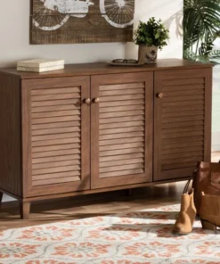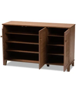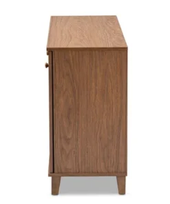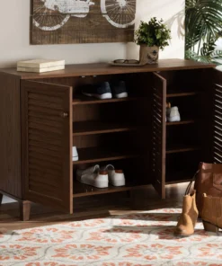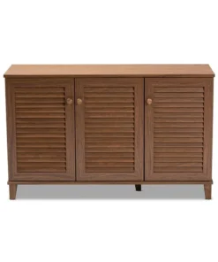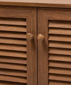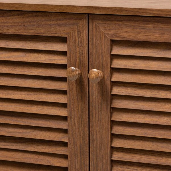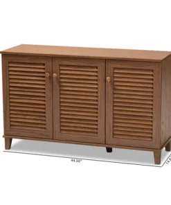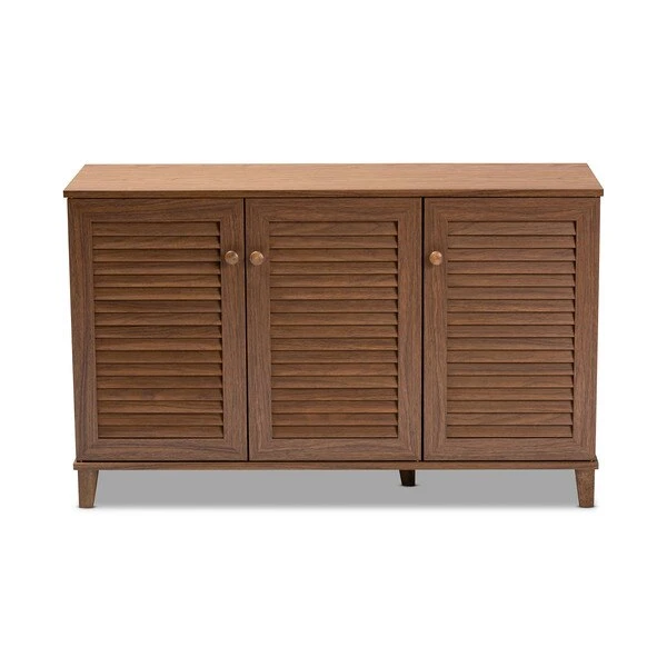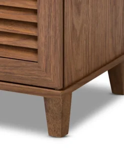 Store your shoes on the sly with the Coolidge shoe cabinet. Three slatted doors, fitted with round knobs, conceal eight shelves with storage space for up to 16 pairs of shoes. Tapered legs add refined style and provide elevation to deter dust buildup. Constructed from engineered wood, the Coolidge showcases a classic walnut brown finish that complements any color scheme. The Coolidge shoe cabinet requires assembly.