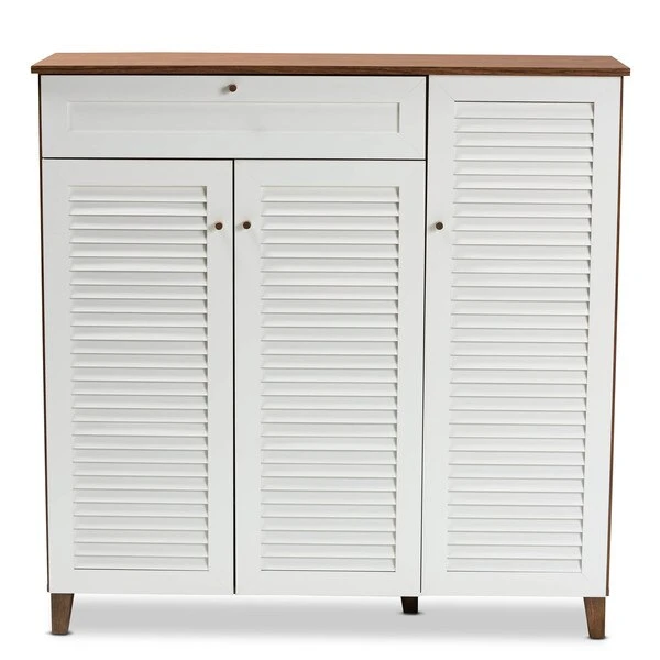 Store your shoes on the sly with the Coolidge shoe cabinet. Three slatted doors, fitted with round knobs, conceal 11 shelves with storage space for up to 21 pairs of shoes. One spacious drawer, accented with inset paneling, provides additional storage space for extra shoelaces and miscellaneous items. Tapered legs add refined style and provide elevation to deter dust buildup. Constructed from engineered wood, the Coolidge showcases a cool white and walnut brown finish that complements any color scheme. The Coolidge shoe cabinet requires assembly.